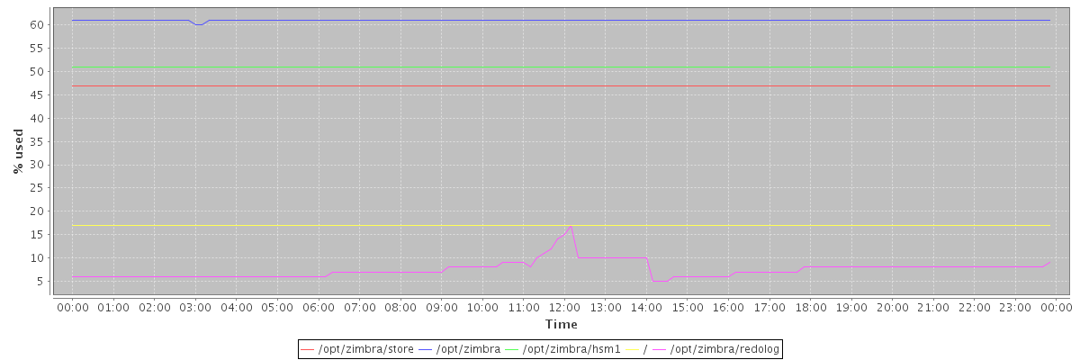 avg(/opt/zimbra/store) = 47.00 avg(/opt/zimbra) = 60.99 avg(/opt/zimbra/hsm1) = 51.00 avg(/) = 17.00 avg(/opt/zimbra/redolog) = 7.50