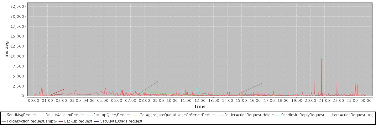 avg(SendMsgRequest) = 274.30 avg(DeleteAccountRequest) = 22360.00 avg(BackupQueryRequest) = 518.20 avg(GetAggregateQuotaUsageOnServerRequest) = 1033.00 avg(FolderActionRequest.delete) = 261.00 avg(SendInviteReplyRequest) = 266.85 avg(ItemActionRequest.!tag) = 236.00 avg(FolderActionRequest.empty) = 747.00 avg(BackupRequest) = 1008.00 avg(GetQuotaUsageRequest) = 1222.00