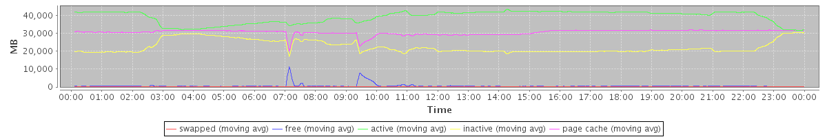 avg(swapped) = 5.32 avg(free) = 614.51 avg(active) = 39243.79 avg(inactive) = 22560.61 avg(page cache) = 30695.15