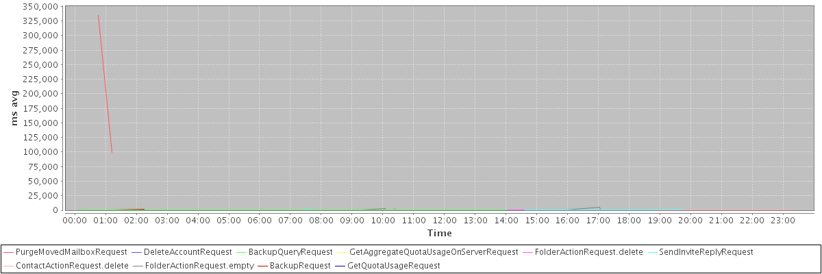 avg(PurgeMovedMailboxRequest) = 217170.50 avg(DeleteAccountRequest) = 3708.00 avg(BackupQueryRequest) = 593.00 avg(GetAggregateQuotaUsageOnServerRequest) = 1313.00 avg(FolderActionRequest.delete) = 1256.00 avg(SendInviteReplyRequest) = 333.90 avg(ContactActionRequest.delete) = 371.25 avg(FolderActionRequest.empty) = 614.17 avg(BackupRequest) = 804.00 avg(GetQuotaUsageRequest) = 1472.00