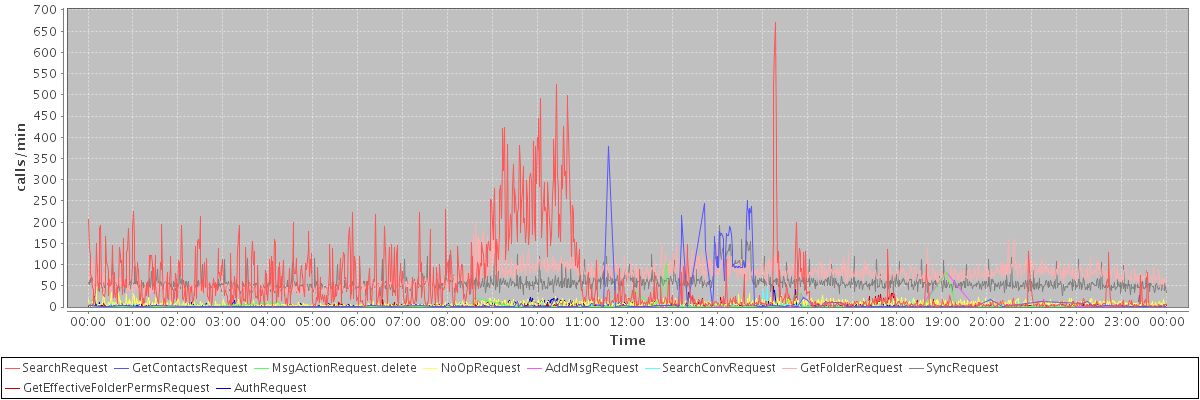max(SearchRequest) = 671.00 max(GetContactsRequest) = 378.00 max(MsgActionRequest.delete) = 106.00 max(NoOpRequest) = 46.00 max(AddMsgRequest) = 82.00 max(SearchConvRequest) = 48.00 max(GetFolderRequest) = 201.00 max(SyncRequest) = 192.00 max(GetEffectiveFolderPermsRequest) = 35.00 max(AuthRequest) = 48.00
