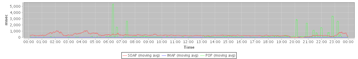 avg(SearchRequest) = 426.51 avg(SendMsgRequest) = 417.79 avg(BackupQueryRequest) = 800.40 avg(GetAggregateQuotaUsageOnServerRequest) = 1651.00 avg(GetFreeBusyRequest) = 252.60 avg(SendInviteReplyRequest) = 310.29 avg(RemoveAttachmentsRequest) = 3189.75 avg(FolderActionRequest.empty) = 3152.62 avg(BackupRequest) = 1087.00 avg(GetQuotaUsageRequest) = 1938.00