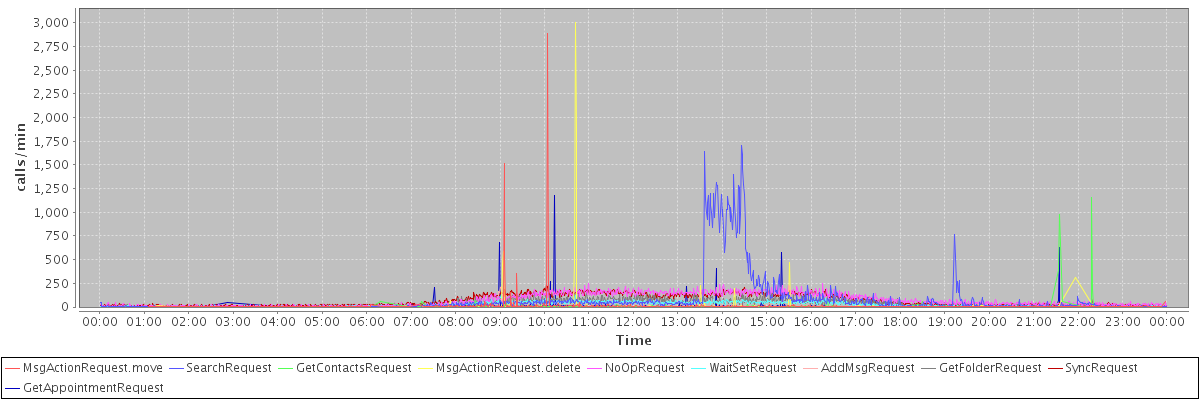 max(MsgActionRequest.move) = 2890.00 max(SearchRequest) = 1711.00 max(GetContactsRequest) = 1158.00 max(MsgActionRequest.delete) = 3008.00 max(NoOpRequest) = 252.00 max(WaitSetRequest) = 155.00 max(AddMsgRequest) = 216.00 max(GetFolderRequest) = 164.00 max(SyncRequest) = 224.00 max(GetAppointmentRequest) = 1180.00