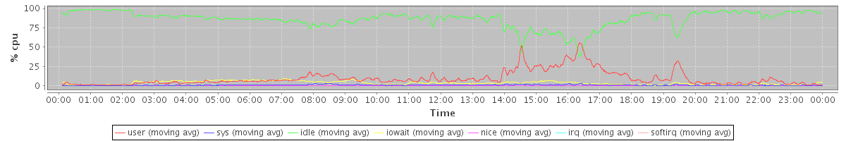 avg(user) = 9.50 avg(sys) = 0.83 avg(idle) = 86.08 avg(iowait) = 3.47 avg(nice) = 0.00 avg(irq) = 0.00 avg(softirq) = 0.11
