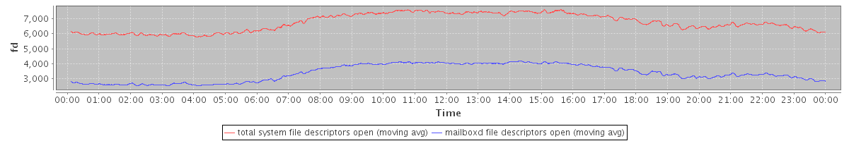 avg(total system file descriptors open) = 6738.82 avg(mailboxd file descriptors open) = 3374.11