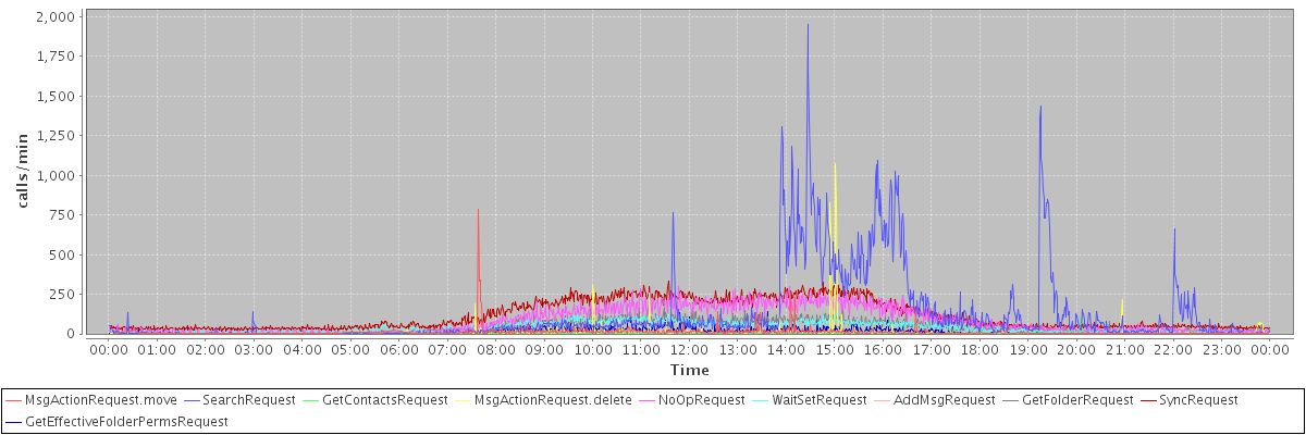 max(MsgActionRequest.move) = 783.00 max(SearchRequest) = 1954.00 max(GetContactsRequest) = 97.00 max(MsgActionRequest.delete) = 1072.00 max(NoOpRequest) = 300.00 max(WaitSetRequest) = 136.00 max(AddMsgRequest) = 185.00 max(GetFolderRequest) = 197.00 max(SyncRequest) = 332.00 max(GetEffectiveFolderPermsRequest) = 143.00
