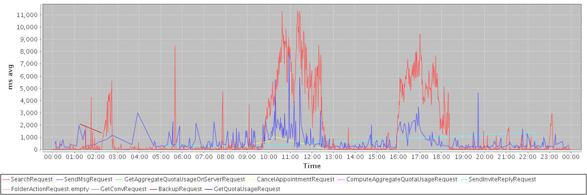 avg(SearchRequest) = 1462.32 avg(SendMsgRequest) = 700.99 avg(GetAggregateQuotaUsageOnServerRequest) = 4167.00 avg(CancelAppointmentRequest) = 543.25 avg(ComputeAggregateQuotaUsageRequest) = 8293.00 avg(SendInviteReplyRequest) = 598.25 avg(FolderActionRequest.empty) = 593.00 avg(GetConvRequest) = 467.00 avg(BackupRequest) = 1727.50 avg(GetQuotaUsageRequest) = 5525.00