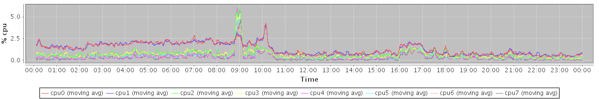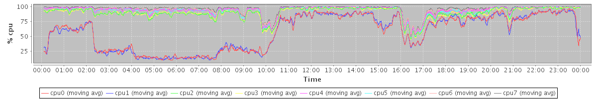 avg(cpu0) = 1.29 avg(cpu1) = 1.30 avg(cpu2) = 0.63 avg(cpu3) = 0.64 avg(cpu4) = 0.42 avg(cpu5) = 0.44 avg(cpu6) = 0.41 avg(cpu7) = 0.30