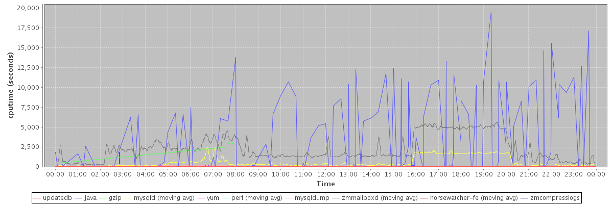avg(updatedb) = 34.86 avg(java) = 2161.84 avg(gzip) = 2778.65 avg(mysqld) = 560.94 avg(yum) = 773.00 avg(perl) = 19.00 avg(mysqldump) = 139.87 avg(zmmailboxd) = 2253.66 avg(horsewatcher-fe) = 17.36 avg(zmcompresslogs) = 894.00