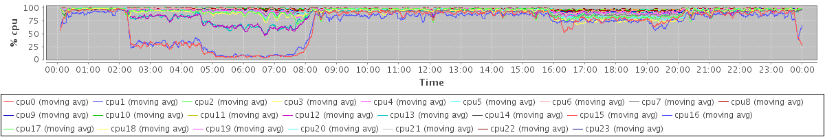 avg(cpu0) = 0.30 avg(cpu1) = 0.40 avg(cpu2) = 0.21 avg(cpu3) = 0.36 avg(cpu4) = 0.10 avg(cpu5) = 0.23 avg(cpu6) = 0.05 avg(cpu7) = 0.10 avg(cpu8) = 0.02 avg(cpu9) = 0.05 avg(cpu10) = 0.01 avg(cpu11) = 0.04 avg(cpu12) = 0.03 avg(cpu13) = 0.07 avg(cpu14) = 0.01 avg(cpu15) = 0.04 avg(cpu16) = 0.03 avg(cpu17) = 0.05 avg(cpu18) = 0.00 avg(cpu19) = 0.02 avg(cpu20) = 0.00 avg(cpu21) = 0.17 avg(cpu22) = 0.00 avg(cpu23) = 0.02