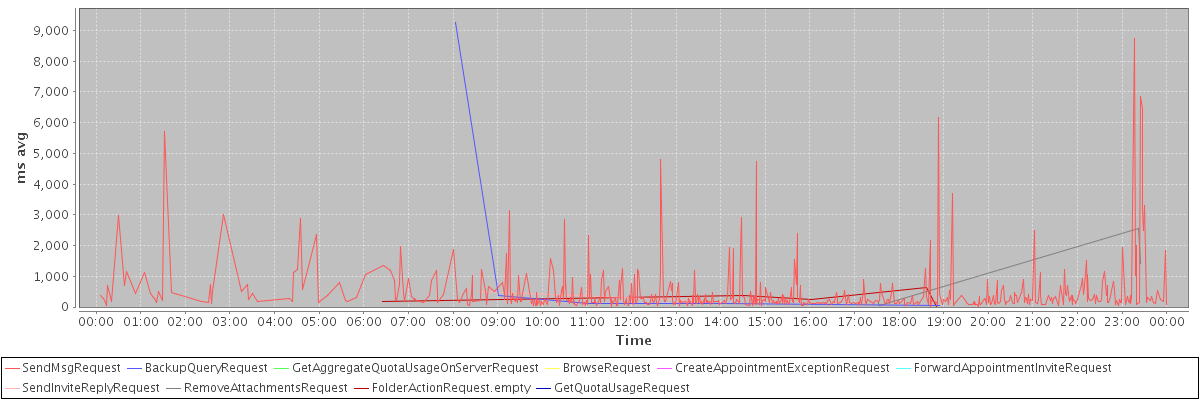avg(SendMsgRequest) = 458.14 avg(BackupQueryRequest) = 1986.20 avg(GetAggregateQuotaUsageOnServerRequest) = 926.00 avg(BrowseRequest) = 326.00 avg(CreateAppointmentExceptionRequest) = 201.00 avg(ForwardAppointmentInviteRequest) = 240.00 avg(SendInviteReplyRequest) = 352.00 avg(RemoveAttachmentsRequest) = 1055.00 avg(FolderActionRequest.empty) = 294.60 avg(GetQuotaUsageRequest) = 1182.00
