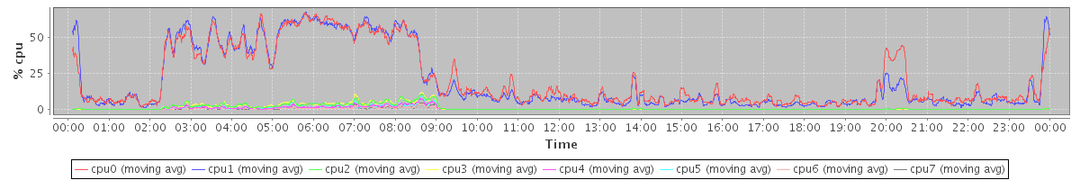 avg(cpu0) = 1.23 avg(cpu1) = 1.17 avg(cpu2) = 0.81 avg(cpu3) = 0.71 avg(cpu4) = 0.52 avg(cpu5) = 0.45 avg(cpu6) = 0.44 avg(cpu7) = 0.25