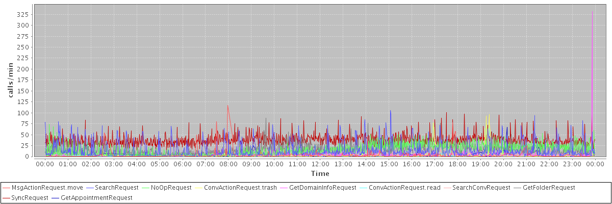 max(MsgActionRequest.move) = 117.00 max(SearchRequest) = 105.00 max(NoOpRequest) = 74.00 max(ConvActionRequest.trash) = 96.00 max(GetDomainInfoRequest) = 332.00 max(ConvActionRequest.read) = 84.00 max(SearchConvRequest) = 95.00 max(GetFolderRequest) = 88.00 max(SyncRequest) = 101.00 max(GetAppointmentRequest) = 67.00