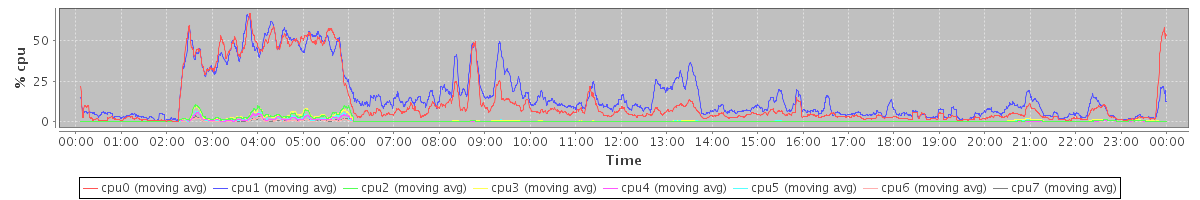 avg(cpu0) = 12.35 avg(cpu1) = 15.90 avg(cpu2) = 0.71 avg(cpu3) = 0.81 avg(cpu4) = 0.35 avg(cpu5) = 0.48 avg(cpu6) = 0.13 avg(cpu7) = 0.19
