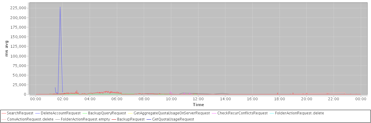 avg(SearchRequest) = 915.40 avg(DeleteAccountRequest) = 43454.83 avg(BackupQueryRequest) = 373.25 avg(GetAggregateQuotaUsageOnServerRequest) = 1380.00 avg(CheckRecurConflictsRequest) = 486.17 avg(FolderActionRequest.delete) = 805.00 avg(ConvActionRequest.delete) = 486.60 avg(FolderActionRequest.empty) = 761.12 avg(BackupRequest) = 1001.50 avg(GetQuotaUsageRequest) = 1438.00