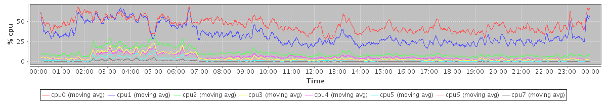 avg(cpu0) = 0.52 avg(cpu1) = 0.30 avg(cpu2) = 0.36 avg(cpu3) = 0.10 avg(cpu4) = 0.30 avg(cpu5) = 0.06 avg(cpu6) = 0.08 avg(cpu7) = 0.03