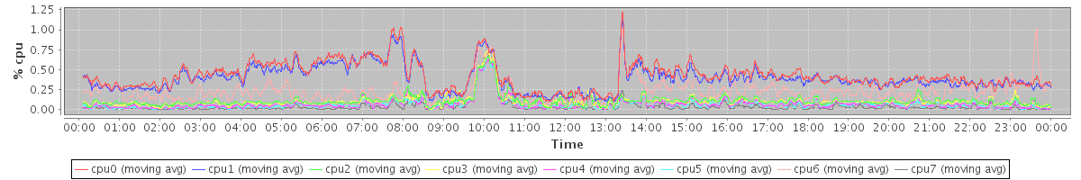avg(cpu0) = 0.42 avg(cpu1) = 0.39 avg(cpu2) = 0.11 avg(cpu3) = 0.11 avg(cpu4) = 0.07 avg(cpu5) = 0.06 avg(cpu6) = 0.23 avg(cpu7) = 0.04