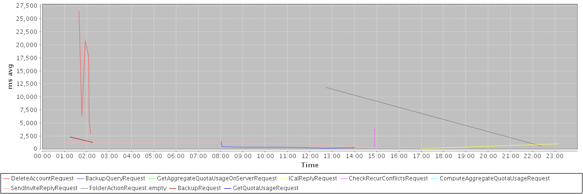 avg(DeleteAccountRequest) = 13299.83 avg(BackupQueryRequest) = 478.67 avg(GetAggregateQuotaUsageOnServerRequest) = 4258.00 avg(ICalReplyRequest) = 479.00 avg(CheckRecurConflictsRequest) = 2169.50 avg(ComputeAggregateQuotaUsageRequest) = 6706.00 avg(SendInviteReplyRequest) = 627.60 avg(FolderActionRequest.empty) = 6142.50 avg(BackupRequest) = 1747.50 avg(GetQuotaUsageRequest) = 5399.00