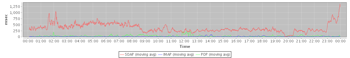 avg(SendInviteReplyRequest) = 426.83 avg(SearchRequest) = 206.00 avg(SendMsgRequest) = 739.23 avg(MsgActionRequest.delete) = 252.33 avg(DeleteAccountRequest) = 8825.00 avg(BackupQueryRequest) = 946.86 avg(GetAggregateQuotaUsageOnServerRequest) = 1089.00 avg(FolderActionRequest.empty) = 212.50 avg(SaveDraftRequest) = 235.42 avg(GetQuotaUsageRequest) = 1146.00