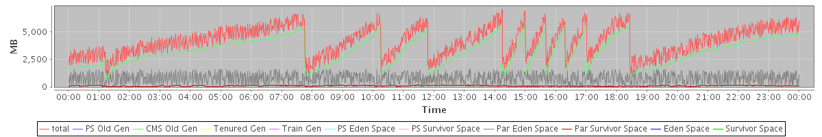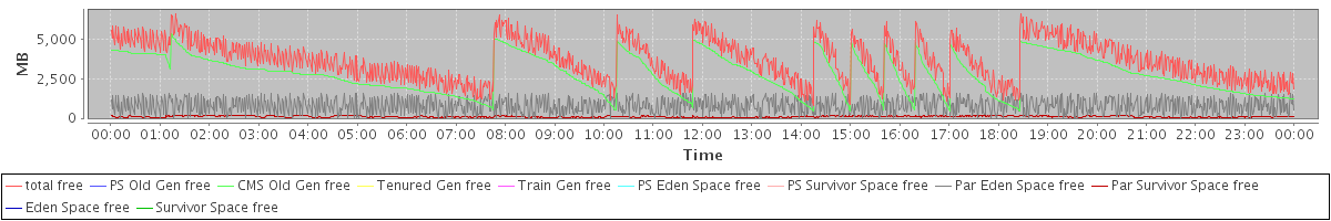 avg(total free) = 3671.88 avg(PS Old Gen free) = 0.00 avg(CMS Old Gen free) = 2772.88 avg(Tenured Gen free) = 0.00 avg(Train Gen free) = 0.00 avg(PS Eden Space free) = 0.00 avg(PS Survivor Space free) = 0.00 avg(Par Eden Space free) = 799.64 avg(Par Survivor Space free) = 99.35 avg(Eden Space free) = 0.00 avg(Survivor Space free) = 0.00