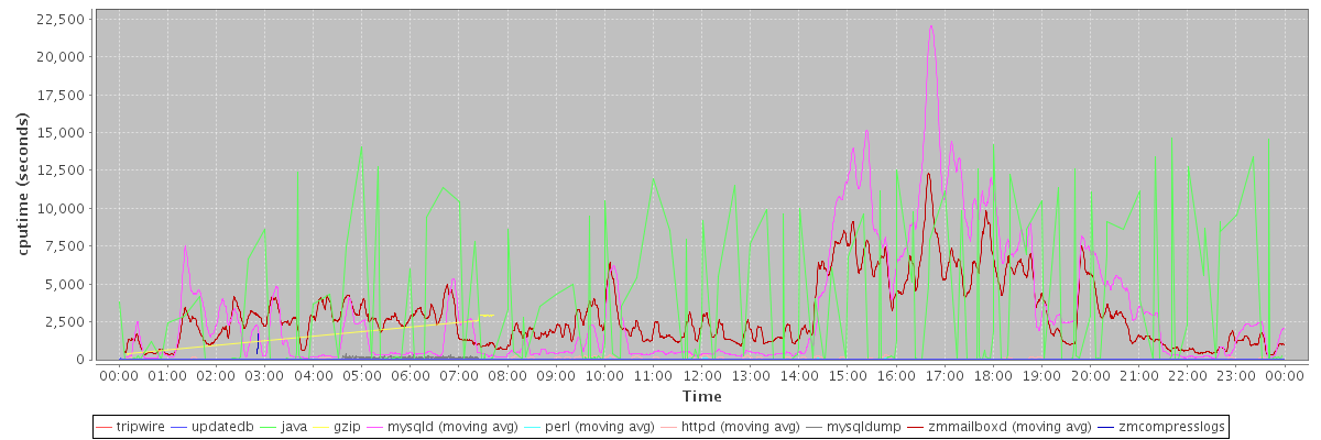 avg(tripwire) = 1860.00 avg(updatedb) = 37.61 avg(java) = 2357.36 avg(gzip) = 2721.80 avg(mysqld) = 3129.08 avg(perl) = 27.63 avg(httpd) = 43.10 avg(mysqldump) = 150.68 avg(zmmailboxd) = 2898.34 avg(zmcompresslogs) = 921.00