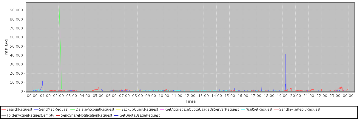 avg(SearchRequest) = 484.25 avg(SendMsgRequest) = 362.57 avg(DeleteAccountRequest) = 48115.50 avg(BackupQueryRequest) = 305.18 avg(GetAggregateQuotaUsageOnServerRequest) = 881.00 avg(WaitSetRequest) = 378.95 avg(SendInviteReplyRequest) = 306.98 avg(FolderActionRequest.empty) = 385.73 avg(SendShareNotificationRequest) = 268.00 avg(GetQuotaUsageRequest) = 1116.00