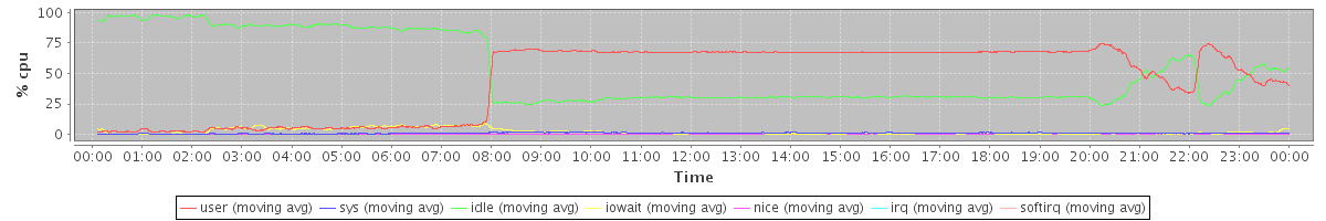 avg(cpu0) = 56.68 avg(cpu1) = 56.96 avg(cpu2) = 50.05 avg(cpu3) = 49.93 avg(cpu4) = 48.11 avg(cpu5) = 48.09 avg(cpu6) = 45.70 avg(cpu7) = 46.47