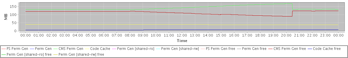 avg(PS Perm Gen) = 0.00 avg(Perm Gen) = 0.00 avg(CMS Perm Gen) = 141.07 avg(Code Cache) = 39.17 avg(Perm Gen [shared-ro]) = 0.00 avg(Perm Gen [shared-rw]) = 0.00 avg(PS Perm Gen free) = 0.00 avg(Perm Gen free) = 0.00 avg(CMS Perm Gen free) = 112.06 avg(Code Cache free) = 7.51 avg(Perm Gen [shared-ro] free) = 0.00 avg(Perm Gen [shared-rw] free) = 0.00