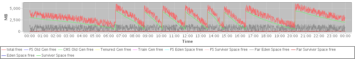 avg(total free) = 3262.79 avg(PS Old Gen free) = 0.00 avg(CMS Old Gen free) = 2396.55 avg(Tenured Gen free) = 0.00 avg(Train Gen free) = 0.00 avg(PS Eden Space free) = 0.00 avg(PS Survivor Space free) = 0.00 avg(Par Eden Space free) = 801.02 avg(Par Survivor Space free) = 65.22 avg(Eden Space free) = 0.00 avg(Survivor Space free) = 0.00