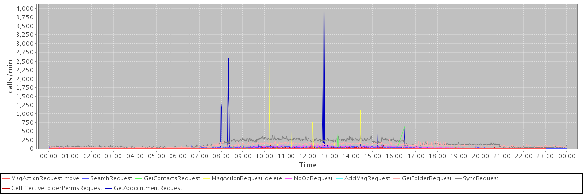max(MsgActionRequest.move) = 195.00 max(SearchRequest) = 132.00 max(GetContactsRequest) = 662.00 max(MsgActionRequest.delete) = 2542.00 max(NoOpRequest) = 145.00 max(AddMsgRequest) = 150.00 max(GetFolderRequest) = 264.00 max(SyncRequest) = 411.00 max(GetEffectiveFolderPermsRequest) = 109.00 max(GetAppointmentRequest) = 3936.00