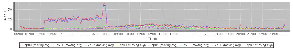 avg(cpu0) = 1.19 avg(cpu1) = 1.12 avg(cpu2) = 0.85 avg(cpu3) = 0.79 avg(cpu4) = 0.53 avg(cpu5) = 0.49 avg(cpu6) = 0.45 avg(cpu7) = 0.25