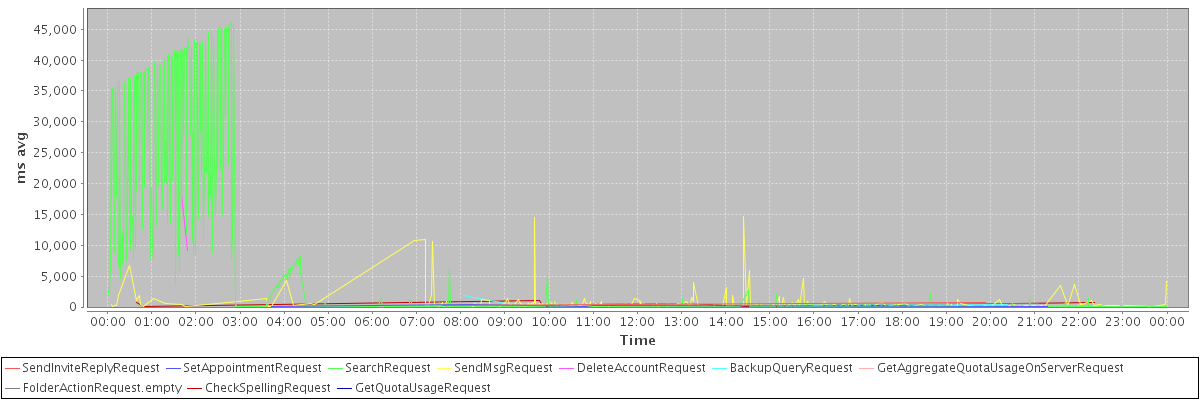 avg(SendInviteReplyRequest) = 378.33 avg(SetAppointmentRequest) = 175.60 avg(SearchRequest) = 4333.31 avg(SendMsgRequest) = 672.89 avg(DeleteAccountRequest) = 13716.00 avg(BackupQueryRequest) = 759.20 avg(GetAggregateQuotaUsageOnServerRequest) = 884.00 avg(FolderActionRequest.empty) = 444.50 avg(CheckSpellingRequest) = 236.89 avg(GetQuotaUsageRequest) = 1179.00