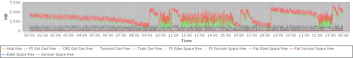 avg(total free) = 3598.04 avg(PS Old Gen free) = 0.00 avg(CMS Old Gen free) = 2733.74 avg(Tenured Gen free) = 0.00 avg(Train Gen free) = 0.00 avg(PS Eden Space free) = 0.00 avg(PS Survivor Space free) = 0.00 avg(Par Eden Space free) = 809.81 avg(Par Survivor Space free) = 54.48 avg(Eden Space free) = 0.00 avg(Survivor Space free) = 0.00