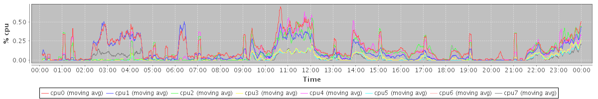 avg(cpu0) = 1.06 avg(cpu1) = 0.85 avg(cpu2) = 0.70 avg(cpu3) = 0.49 avg(cpu4) = 0.60 avg(cpu5) = 0.40 avg(cpu6) = 0.43 avg(cpu7) = 0.35
