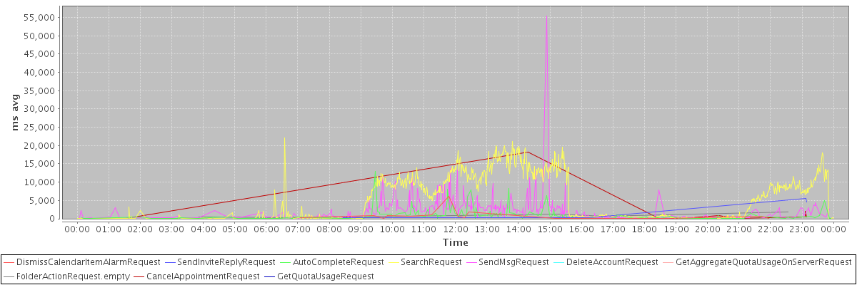 avg(DismissCalendarItemAlarmRequest) = 992.21 avg(SendInviteReplyRequest) = 2662.00 avg(AutoCompleteRequest) = 989.56 avg(SearchRequest) = 5429.52 avg(SendMsgRequest) = 2410.02 avg(DeleteAccountRequest) = 9540.00 avg(GetAggregateQuotaUsageOnServerRequest) = 3634.00 avg(FolderActionRequest.empty) = 943.67 avg(CancelAppointmentRequest) = 2133.55 avg(GetQuotaUsageRequest) = 4871.00