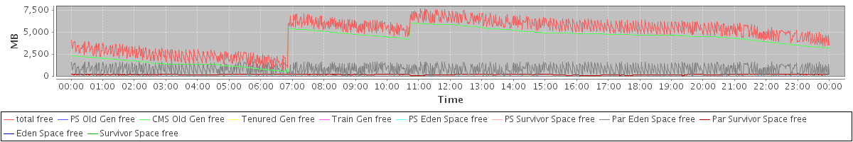 avg(total free) = 4728.26 avg(PS Old Gen free) = 0.00 avg(CMS Old Gen free) = 3782.28 avg(Tenured Gen free) = 0.00 avg(Train Gen free) = 0.00 avg(PS Eden Space free) = 0.00 avg(PS Survivor Space free) = 0.00 avg(Par Eden Space free) = 797.15 avg(Par Survivor Space free) = 148.83 avg(Eden Space free) = 0.00 avg(Survivor Space free) = 0.00