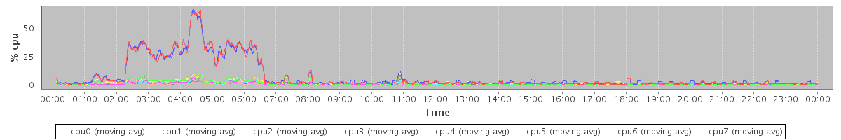 avg(cpu0) = 11.33 avg(cpu1) = 11.81 avg(cpu2) = 0.91 avg(cpu3) = 0.90 avg(cpu4) = 0.48 avg(cpu5) = 0.45 avg(cpu6) = 0.22 avg(cpu7) = 0.19