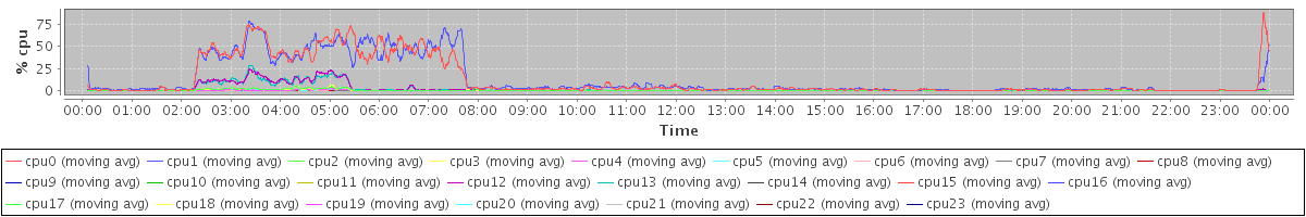 avg(cpu0) = 0.44 avg(cpu1) = 0.45 avg(cpu2) = 0.21 avg(cpu3) = 0.23 avg(cpu4) = 0.11 avg(cpu5) = 0.09 avg(cpu6) = 0.08 avg(cpu7) = 0.08 avg(cpu8) = 0.07 avg(cpu9) = 0.04 avg(cpu10) = 0.05 avg(cpu11) = 0.05 avg(cpu12) = 0.23 avg(cpu13) = 0.23 avg(cpu14) = 0.54 avg(cpu15) = 0.50 avg(cpu16) = 0.16 avg(cpu17) = 0.18 avg(cpu18) = 0.06 avg(cpu19) = 0.06 avg(cpu20) = 0.07 avg(cpu21) = 0.06 avg(cpu22) = 0.05 avg(cpu23) = 0.07