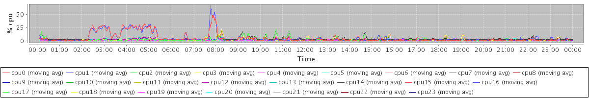 avg(cpu0) = 4.91 avg(cpu1) = 5.12 avg(cpu2) = 1.63 avg(cpu3) = 1.60 avg(cpu4) = 0.52 avg(cpu5) = 0.49 avg(cpu6) = 0.24 avg(cpu7) = 0.49 avg(cpu8) = 0.18 avg(cpu9) = 0.18 avg(cpu10) = 0.17 avg(cpu11) = 0.16 avg(cpu12) = 1.41 avg(cpu13) = 1.41 avg(cpu14) = 3.43 avg(cpu15) = 3.21 avg(cpu16) = 1.29 avg(cpu17) = 1.23 avg(cpu18) = 0.42 avg(cpu19) = 0.40 avg(cpu20) = 0.21 avg(cpu21) = 0.32 avg(cpu22) = 0.13 avg(cpu23) = 0.25