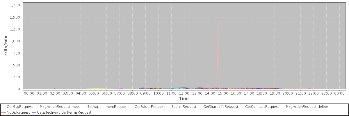 max(GetMsgRequest) = 19.00 max(MsgActionRequest.move) = 18.00 max(SetAppointmentRequest) = 26.00 max(GetFolderRequest) = 21.00 max(SearchRequest) = 30.00 max(GetShareInfoRequest) = 18.00 max(GetContactsRequest) = 1724.00 max(MsgActionRequest.delete) = 43.00 max(NoOpRequest) = 26.00 max(GetEffectiveFolderPermsRequest) = 25.00
