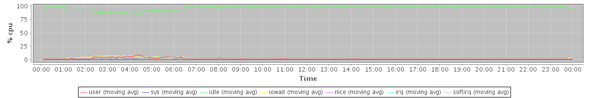 avg(user) = 1.53 avg(sys) = 0.23 avg(idle) = 96.91 avg(iowait) = 1.33 avg(nice) = 0.00 avg(irq) = 0.00 avg(softirq) = 0.00