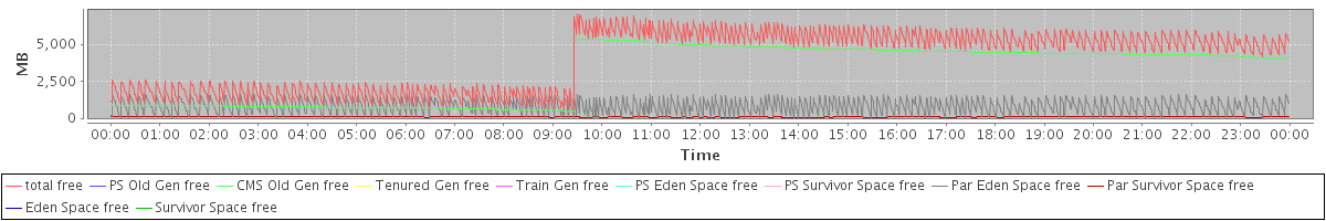 avg(total free) = 3981.46 avg(PS Old Gen free) = 0.00 avg(CMS Old Gen free) = 3082.11 avg(Tenured Gen free) = 0.00 avg(Train Gen free) = 0.00 avg(PS Eden Space free) = 0.00 avg(PS Survivor Space free) = 0.00 avg(Par Eden Space free) = 802.50 avg(Par Survivor Space free) = 96.85 avg(Eden Space free) = 0.00 avg(Survivor Space free) = 0.00