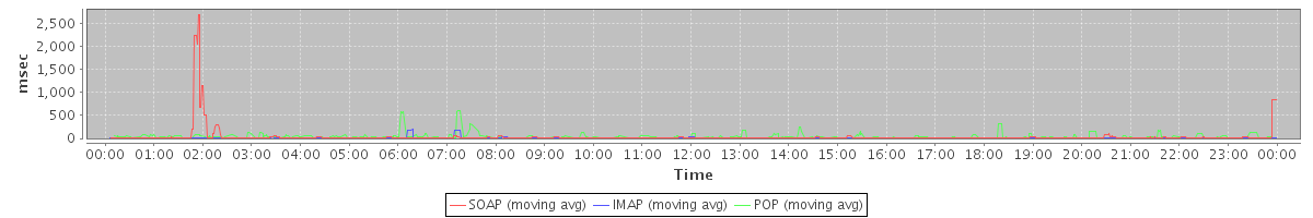 avg(BackupQueryRequest) = 292.00 avg(GetAggregateQuotaUsageOnServerRequest) = 1002.00 avg(AutoCompleteRequest) = 178.23 avg(SendMsgRequest) = 1058.63 avg(BackupRequest) = 986.00 avg(SaveDraftRequest) = 86.69 avg(CreateAppointmentRequest) = 48.67 avg(GetQuotaUsageRequest) = 1092.00 avg(DeleteAccountRequest) = 40719.71 avg(SearchGalRequest) = 54.07