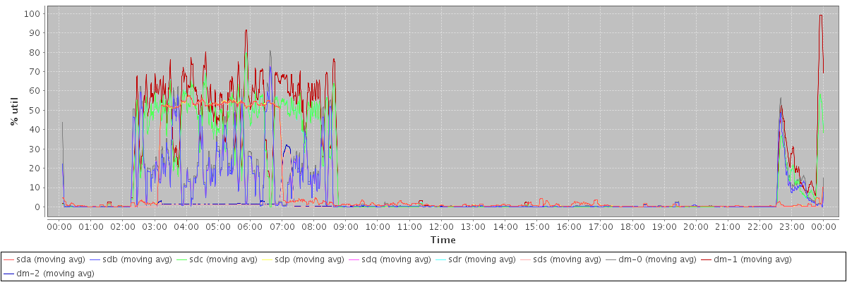 avg(sda) = 9.44 avg(sdb) = 6.94 avg(sdc) = 13.28 avg(sdp) = 9.45 avg(sdq) = 6.94 avg(sdr) = 13.29 avg(sds) = 0.63 avg(dm-0) = 7.85 avg(dm-1) = 16.34 avg(dm-2) = 0.76