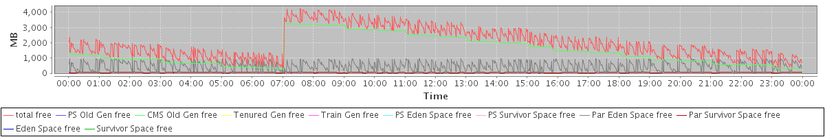 avg(total free) = 1990.06 avg(PS Old Gen free) = 0.00 avg(CMS Old Gen free) = 1454.64 avg(Tenured Gen free) = 0.00 avg(Train Gen free) = 0.00 avg(PS Eden Space free) = 0.00 avg(PS Survivor Space free) = 0.00 avg(Par Eden Space free) = 480.03 avg(Par Survivor Space free) = 55.40 avg(Eden Space free) = 0.00 avg(Survivor Space free) = 0.00