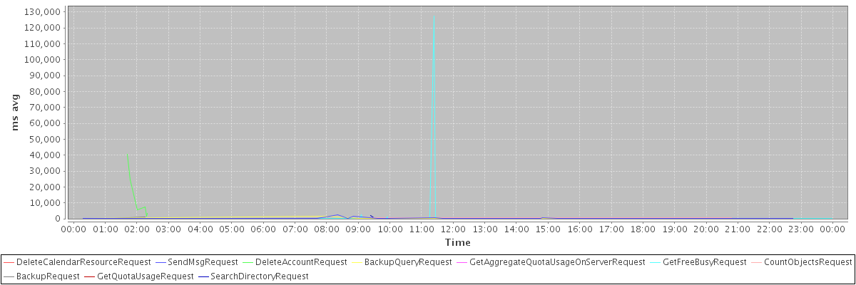 avg(DeleteCalendarResourceRequest) = 2462.00 avg(SendMsgRequest) = 314.26 avg(DeleteAccountRequest) = 13912.00 avg(BackupQueryRequest) = 381.29 avg(GetAggregateQuotaUsageOnServerRequest) = 1151.00 avg(GetFreeBusyRequest) = 384.95 avg(CountObjectsRequest) = 506.00 avg(BackupRequest) = 807.50 avg(GetQuotaUsageRequest) = 1294.00 avg(SearchDirectoryRequest) = 539.50