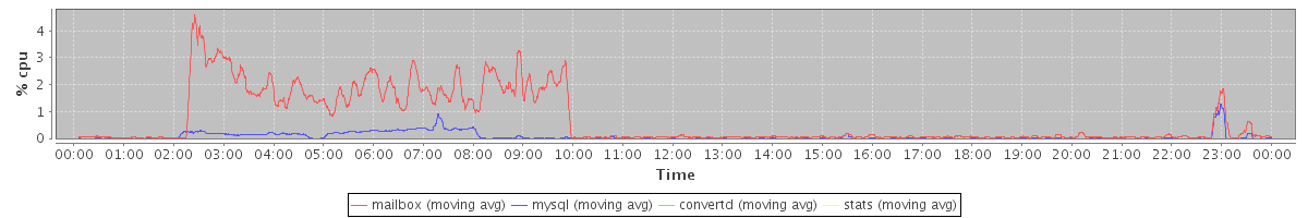 avg(mailbox) = 0.69 avg(mysql) = 0.08 avg(convertd) = 0.00 avg(stats) = 0.00