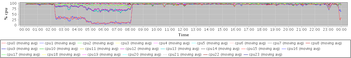 avg(cpu0) = 0.09 avg(cpu1) = 0.07 avg(cpu2) = 0.00 avg(cpu3) = 0.00 avg(cpu4) = 0.00 avg(cpu5) = 0.00 avg(cpu6) = 0.00 avg(cpu7) = 0.00 avg(cpu8) = 0.00 avg(cpu9) = 0.00 avg(cpu10) = 0.00 avg(cpu11) = 0.00 avg(cpu12) = 0.00 avg(cpu13) = 0.00 avg(cpu14) = 0.02 avg(cpu15) = 0.00 avg(cpu16) = 0.00 avg(cpu17) = 0.00 avg(cpu18) = 0.00 avg(cpu19) = 0.00 avg(cpu20) = 0.00 avg(cpu21) = 0.00 avg(cpu22) = 0.00 avg(cpu23) = 0.00