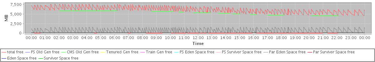 avg(total free) = 6187.80 avg(PS Old Gen free) = 0.00 avg(CMS Old Gen free) = 5336.33 avg(Tenured Gen free) = 0.00 avg(Train Gen free) = 0.00 avg(PS Eden Space free) = 0.00 avg(PS Survivor Space free) = 0.00 avg(Par Eden Space free) = 770.18 avg(Par Survivor Space free) = 81.29 avg(Eden Space free) = 0.00 avg(Survivor Space free) = 0.00