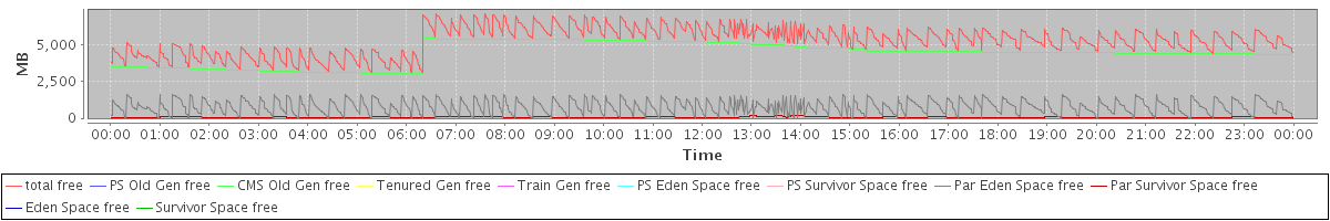 avg(total free) = 5270.97 avg(PS Old Gen free) = 0.00 avg(CMS Old Gen free) = 4416.98 avg(Tenured Gen free) = 0.00 avg(Train Gen free) = 0.00 avg(PS Eden Space free) = 0.00 avg(PS Survivor Space free) = 0.00 avg(Par Eden Space free) = 787.40 avg(Par Survivor Space free) = 66.60 avg(Eden Space free) = 0.00 avg(Survivor Space free) = 0.00